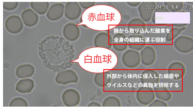 その動画を拡大しパソコンモニターに映し出し、血液の汚れや形状の変化、免疫の働きをしている白血球の状態を確認し体質改善を適切に行うことを目的としております。