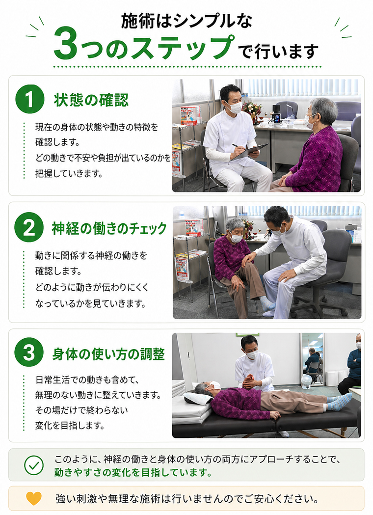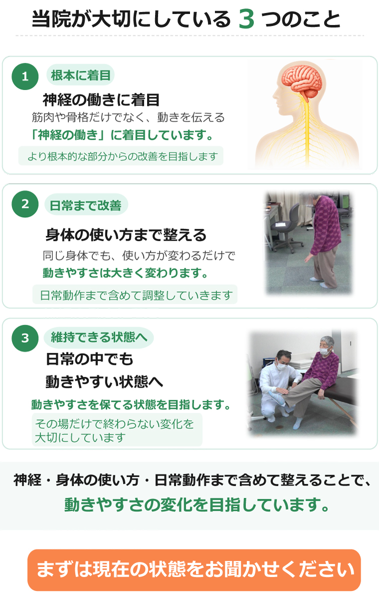 薬だけでは動きにくさの根本が変わりにくい場合があります。