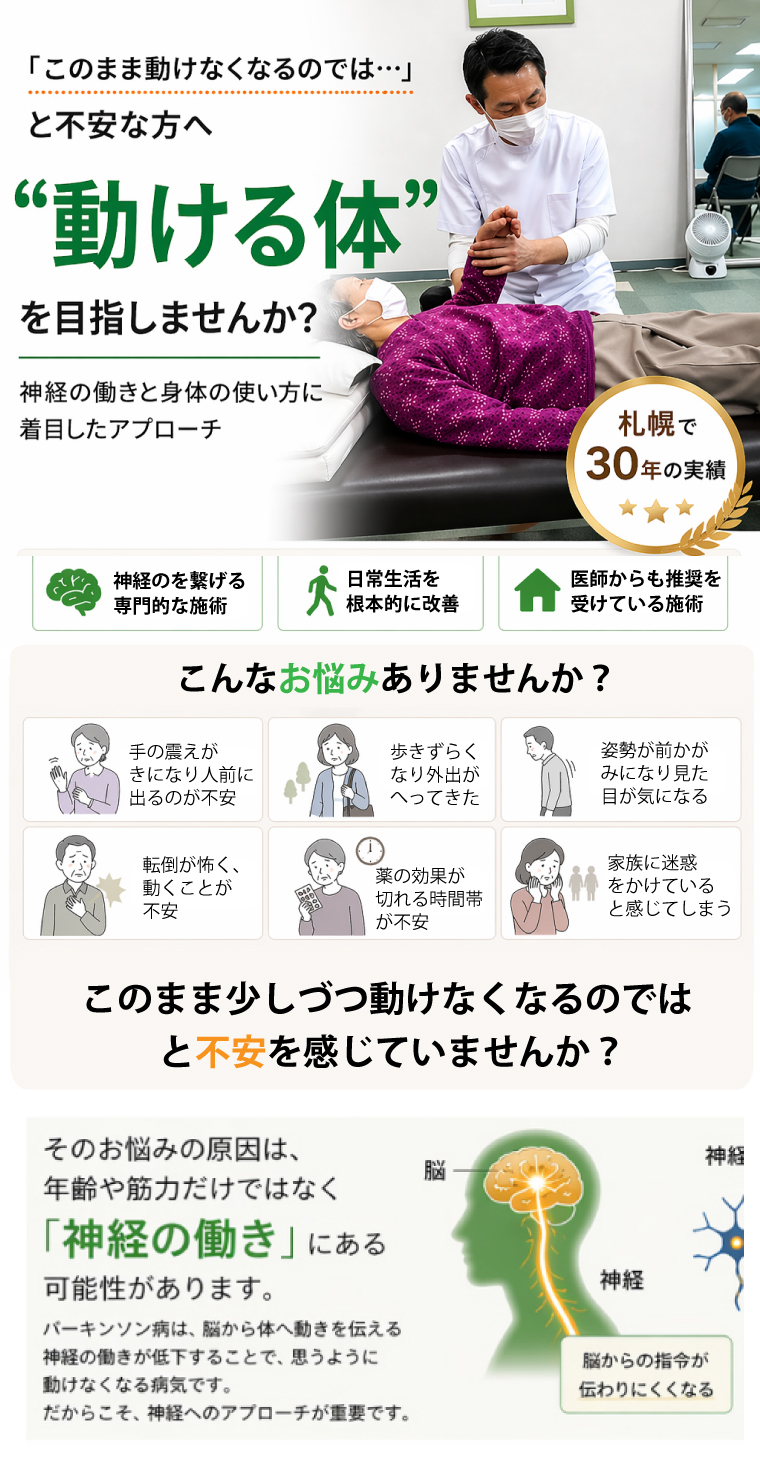 脳から体へ動きを伝える神経の働きが低下することで、思うように体が動きにくくなる状態です。